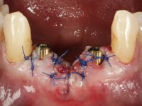 Female patient, 62 years old, smoker. 10 years ago, an implant had been placed in the area of teeth 41 and 42 to rehabilitate the lack of these two teeth with a two-element bridge. After the imaging exam, bone loss was observed next to the implant compatible with peri-implantitis. The buccal bone wall next to the implant showed extensive resorption, with the buccal surface of the implant in contact with the soft tissues and in a certain area a hole allowed the implant to be visualized through the gingival tissue. Teeth 42 and 32 already showed some mobility.