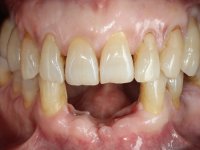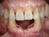 Faced with two possibilities, try to use the implant or remove it, I chose to remove it. Two reasons for this decision, first, the buccal bone loss was very extensive and second, the adjacent teeth had a poor prognosis in the medium term. In this sense, it was proposed to remove the implant, extract teeth 42 and 32, simultaneously place 2 implants in their place and immediately rehabilitate the area with a 4-piece screw-retained temporary bridge. After osseointegration, a 4-element screw-retained bridge would be made with ceramic in a coronal and gingival shade.