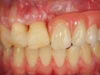Male patient, 22 years old, non-smoker, appear in our dental office 6 months after a car accident where he lost teeth 21, 22, 23 and 24. Teeth 12 and 11 present mobility grade III, thus with a prognosis of extraction. The gengiva architecture of the edentulous area presents a recession and a flat surface.