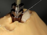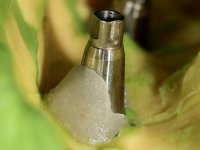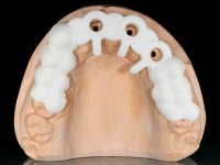 10 weeks after the surgery, a first impression was done to do a CAD-CAM provisional bridge (based on the diagnostic wax-up), that worked the soft tissue architecture during two months. This architecture was copied in a second impression by individualizing the impression copings in their emerging profile.